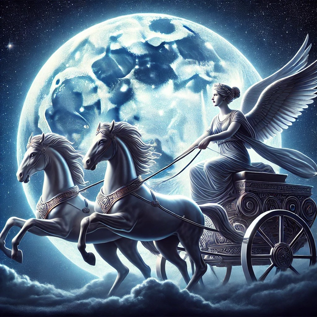 Selene is the Greek goddess of the moon, often depicted driving her silver chariot across the night sky, pulled by two winged horses. She is the personification of the moon, representing its beauty, mystery, and cyclical nature. Selene was believed to illuminate the night, marking the passage of time and symbolising both life and death. Her powers were associated with fertility, change, and the lunar phases, which ancient Greeks thought influenced human life, agricultural cycles, and the tides.
