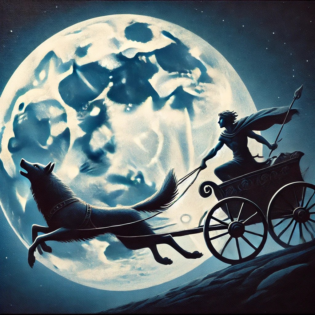 In Norse mythology, Máni is the personification of the moon and is constantly pursued by the wolf Hati. He is the brother of Sól, the sun goddess, and together they represent the eternal chase of time across the sky. According to legend, during Ragnarök (the end of the world), Hati will eventually devour Máni. Máni is often associated with fate and the passage of time, as well as being a guardian of the night. He was believed to have power over the moon’s phases, which could control the tides and bring about change in nature and life.