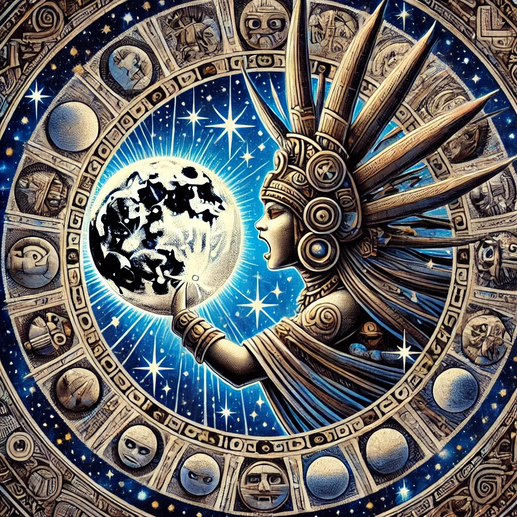 Coyolxauhqui is the goddess of the moon in Aztec mythology. She is known for leading a rebellion against her mother, the Earth goddess Coatlicue, and being dismembered by her brother Huitzilopochtli, the sun god. Her body parts were scattered across the sky, symbolising the phases of the moon. Coyolxauhqui represents the duality of creation and destruction, as well as the cosmic struggle between light and darkness, embodying the chaotic and cyclical nature of the moon’s power in Aztec beliefs.