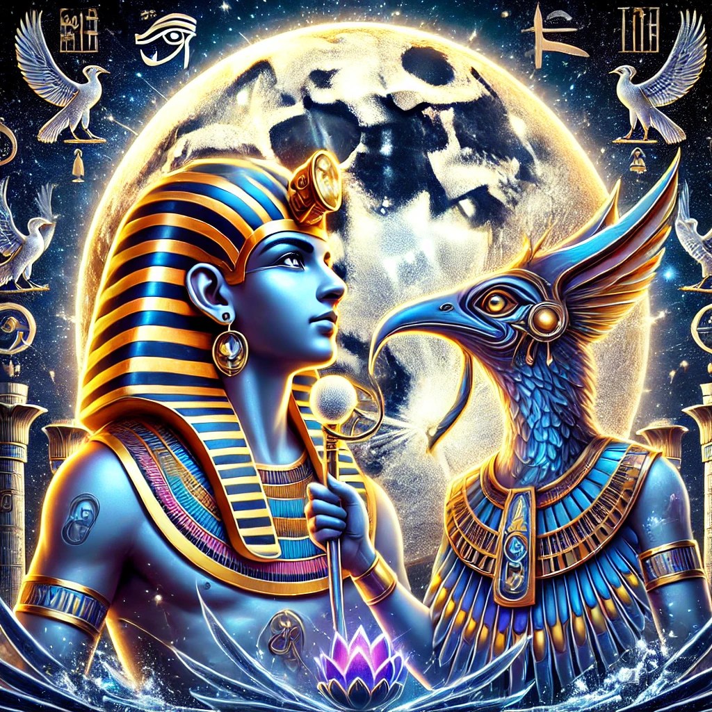 Thoth is the Egyptian god of the moon, writing, knowledge, and wisdom. He is often depicted with the head of an ibis and a lunar disc. As the god of knowledge and writing, Thoth was believed to have created the 365-day calendar by using his knowledge of the moon’s cycles. Thoth was also responsible for maintaining balance and order in the universe, ensuring that both the moon and sun followed their courses. He was a deity of science, magic, and writing, making him a key figure in Egyptian cosmology. - Thoth is one of two Egyptian gods associated with the moon. Unlike Khonsu, who is connected with the physical aspects of the moon, such as time and protection during the night, Thoth represents the intellectual and metaphysical qualities of the moon. Thoth’s focus is on wisdom, writing, and the balance of cosmic order, as well as using the cycles of the moon for knowledge and maintaining the universe’s structure. His lunar connection is more about enlightenment and understanding, in contrast to Khonsu’s role as a protector and guide during the night.